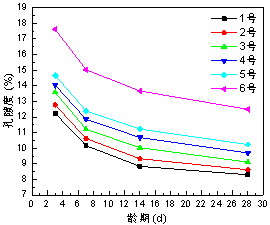 圖8顯示了不同減縮劑摻量隨時(shí)間變化對(duì)水泥基注漿材料孔隙度的影響。不同減縮劑摻量的水泥基注漿材料孔隙率隨時(shí)間呈下降趨勢(shì),但隨著減縮劑含量的增加,孔隙度增加。這說(shuō)明孔隙度隨著齡期增長(zhǎng)而逐漸提高,而到14天齡期后孔隙度增長(zhǎng)逐漸減小,且減縮劑摻量越大對(duì)水泥基注漿材料孔隙度增長(zhǎng)更加明顯。