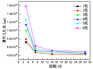 圖9顯示了不同齡期最可幾孔徑,從圖中可知,隨著減縮摻量的增加,最可幾孔徑始終增加。與未摻減縮劑空白組相比,摻2.5%和4.5%減縮劑的水泥基注漿材料最可幾孔徑在第3天分別提高了39.09%和120.52%,在第28天分別提高了4.99%和14.97%。此外,隨著齡期增長(zhǎng),減縮劑摻量對(duì)最可幾孔徑的影響逐漸減小。