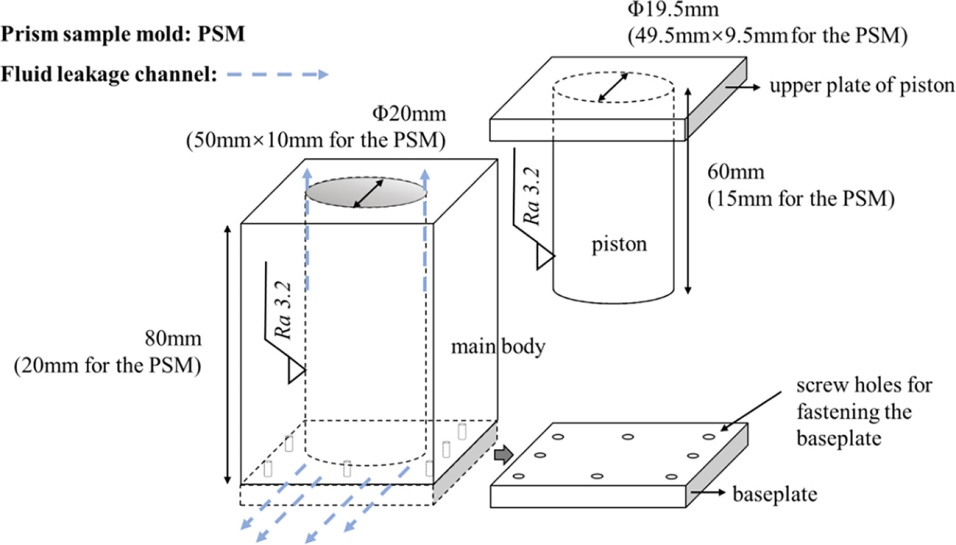 在這項(xiàng)工作中使用兩種鋼模具,一種是圓腔部分(ф20毫米),另一種是矩形腔部分(50毫米×10毫米),用于制備C-S-H塊樣品。模具的結(jié)構(gòu)如下圖所示。樣品完成擠壓后,導(dǎo)出模具,并放置在密封室架子上,架子下有足夠的去離子水,使其完全濕潤。制備了三組C-S-H樣品,標(biāo)記為C09H、C12H和C15H,原材料配方中的Ca/Si比率為0.9、1.2和1.5,樣品的測(cè)量體積密度為1.69g/cm3。對(duì)于Ca/Si比為0.9的配方,再制備一個(gè)C-S-H樣品,表示為C09L,測(cè)量的體積密度為1.50g/cm3。