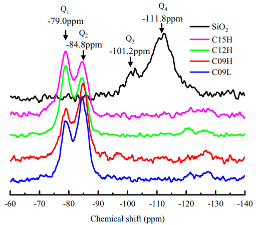 如圖3所示,硅核磁共振被用來接收更多關(guān)于所獲得的C-S-H樣品結(jié)構(gòu)的信息。對(duì)于SiO2,觀察到兩個(gè)峰值,分別為-101.2ppm的Q3和-111.8ppm的Q4。對(duì)于C-S-H樣品,檢測(cè)到另外的兩個(gè)峰值,分別為-79.0ppm的Q1和-84.8ppm的Q2,而Q3和Q4信號(hào)發(fā)生消失,表明完全消耗掉了SiO2。