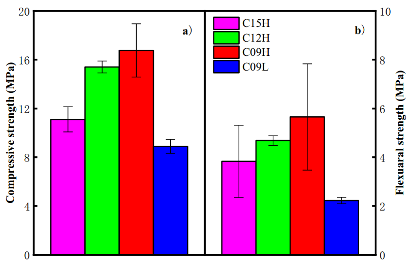 圖4 樣品機(jī)械強(qiáng)度:a)抗壓強(qiáng)度;b)抗彎強(qiáng)度