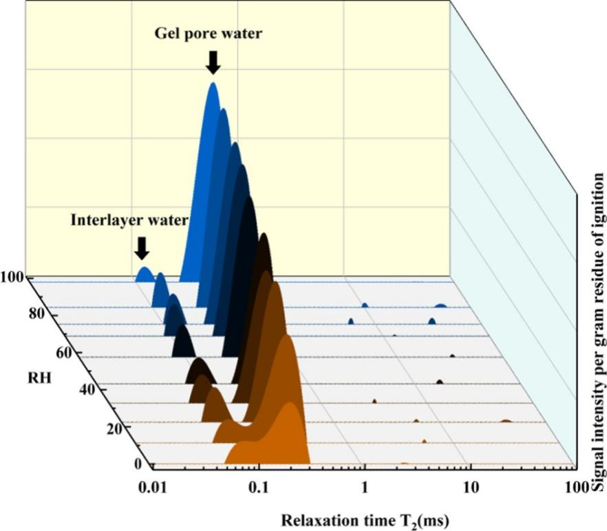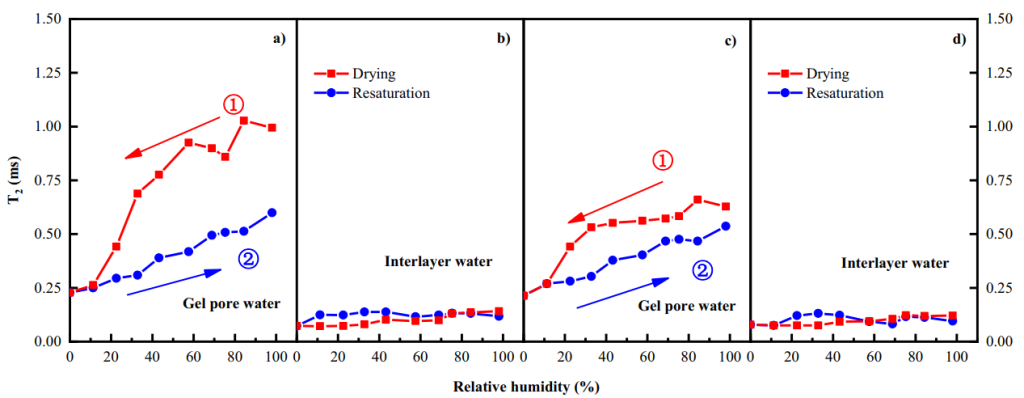 基本上,從圖6中可以看出。層間水的T2值在D-R循環(huán)期間沒有表現(xiàn)出明顯的變化,而凝膠孔隙水的T2值在干燥期間逐漸減少,在隨后的再飽和過程中增加,這可以用一個(gè)簡(jiǎn)單的水去除-補(bǔ)充過程來解釋。有趣的是,在給定的RH(RH>11%)下,重飽和度曲線中的凝膠孔隙水的T2值低于干燥曲線中的T2值,這表明當(dāng)C-S-H經(jīng)歷了嚴(yán)重的干燥處理(RH為0%)時(shí),與初始飽和C-S-H中的凝膠孔隙水相比,水分子在C-S-H凝膠孔隙中的約束更高。凝膠孔的尺寸減少和吸收減少都可能導(dǎo)致更多的凝膠孔隙水的限制,從而降低了T2值。