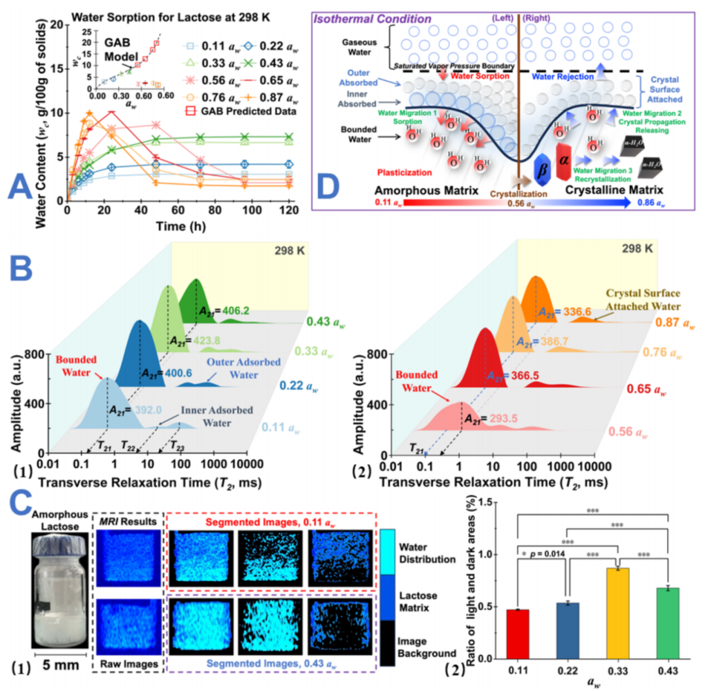 圖1. 無定形乳糖在水分活度aw = 0.11? 0.87及298K條件下的吸水行為與遷移動力學的綜合研究。