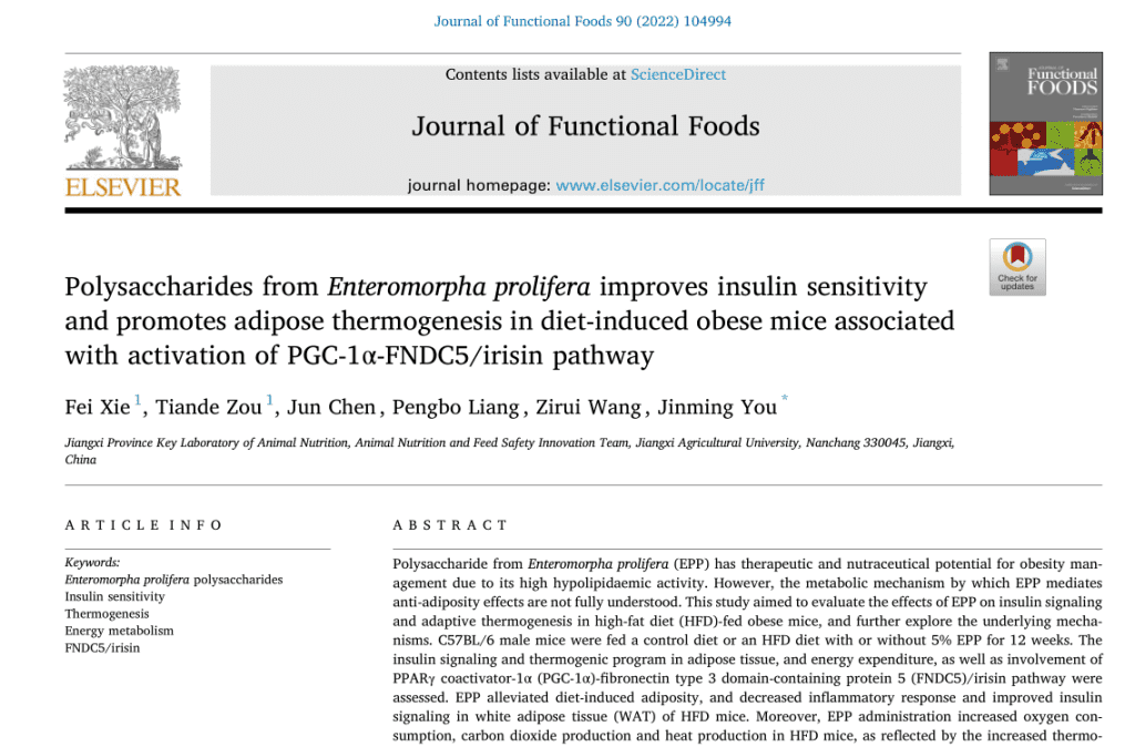 對(duì)此,江西農(nóng)業(yè)大學(xué)動(dòng)物與營(yíng)養(yǎng)實(shí)驗(yàn)室謝飛,鄒天德一行2022年發(fā)表于《Journal of Functional Foods》的《Polysaccharides from Enteromorpha prolifera improves insulin sensitivity and promotes adipose thermogenesis in diet-induced obese mice associated with activation of PGC-1a-FNDC5/irisin pathway》的文獻(xiàn)揭示了,滸苔多糖可以防止哺乳動(dòng)物高脂肪飲食引起的肥胖。證實(shí)了,滸苔多糖通過提高飲食誘導(dǎo)的肥胖小鼠的胰島素敏感性并促進(jìn)脂肪產(chǎn)熱,從而發(fā)生能量消耗達(dá)到反肥胖反應(yīng)的效果。