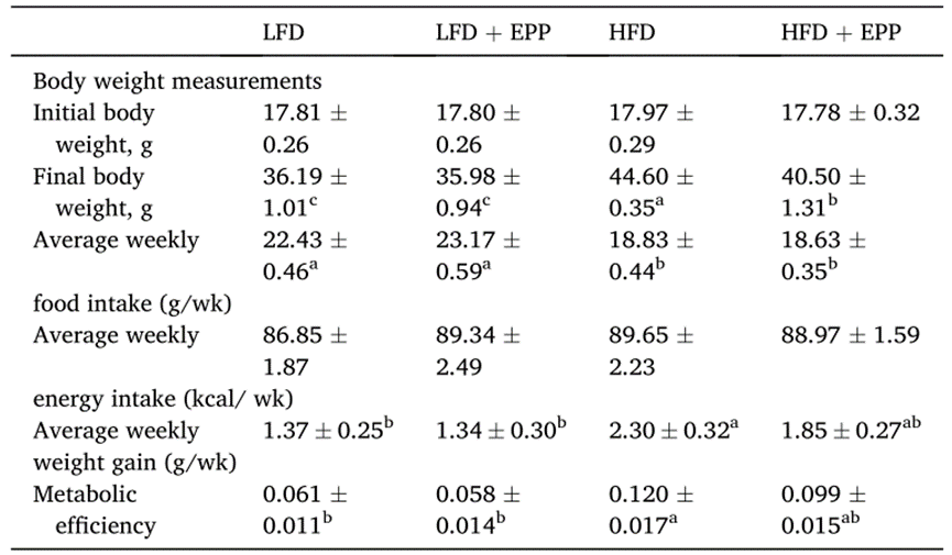總之,在該研究中,間接測(cè)熱系統(tǒng)表明,EPP引起的代謝活性增強(qiáng)和體脂率下降與增加身體的能量消耗有關(guān)。研究數(shù)據(jù)表明,膳食中補(bǔ)充EPP減少了脂肪和炎癥,增強(qiáng)了胰島素敏感性,以及棕色和米色脂肪的生成,從而改善了HFD小鼠的代謝健康。這些發(fā)現(xiàn)提示,EPP可以作為一種潛在的功能成分,抵消與不健康生活方式(高能量、高脂肪攝入和缺乏身體活動(dòng))相關(guān)的不良影響,即肥胖及肥胖引起的并發(fā)癥。