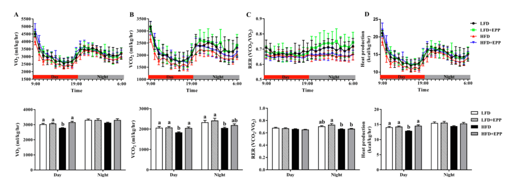 產(chǎn)量(VCO2)及其平均值。(C)根據(jù)代謝室數(shù)據(jù)計(jì)算呼吸交換比(RER、VCO2/VO2).(D)12h光-12h暗循環(huán)期間的產(chǎn)熱量及平均值。結(jié)果表明:與高脂飲食組相比,EPP組小鼠在白天的耗氧量、二氧化碳產(chǎn)量和產(chǎn)熱量均較高,夜間(活動(dòng)期),高脂飲食小鼠的RER低于LFD+EPP小鼠。總之膳食EPP通過增加了高脂肪喂養(yǎng)的肥胖小鼠的能量消耗,從而達(dá)到預(yù)防飲食引起的肥胖。