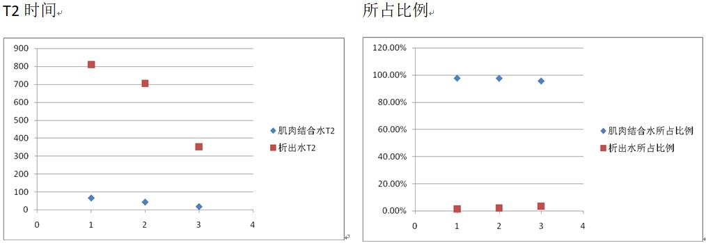 從上圖可知,在干燥3小時樣品中存在的析出水峰和肌肉結合水峰在干燥4.5小時的樣品中消失了,因為再短的析出水峰T2值總是要比初始肌肉結合水T2長的,顯然在大于65ms以外的地方在干燥4.5小時的譜上沒有任何的峰存在。當樣品不再析出水分了,說明肌肉組織已經(jīng)遭到破壞沒有持水力了,肌肉結合水也完全消失。因此,從第二個階段起,圖上的譜峰已經(jīng)不再是析出水分和肌肉結合水了。