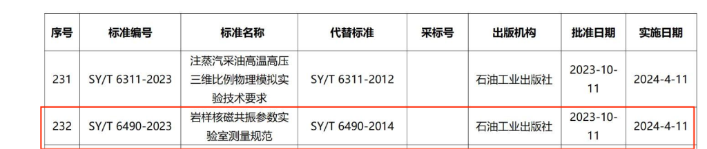 國(guó)家能源局于2023年10月11日發(fā)布《中華人民共和國(guó)石油天然氣行業(yè)標(biāo)準(zhǔn)》,從2024年4月11日起施行。其中《巖樣核磁共振參數(shù)實(shí)驗(yàn)室測(cè)量規(guī)范》明確規(guī)定了,實(shí)驗(yàn)室測(cè)量巖樣核磁共振參數(shù)的主要測(cè)量?jī)x器、主要試劑制備、巖樣制備、巖樣測(cè)量、結(jié)果處理和允許不確定度的要求。適用于巖樣或巖屑核磁共振參數(shù)的測(cè)量。